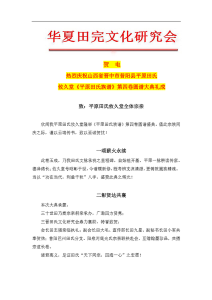 【贺 电 】热烈庆祝山西省晋中市昔阳县平原田氏 攸久堂《平原田氏族谱》第四卷圆谱大典礼成